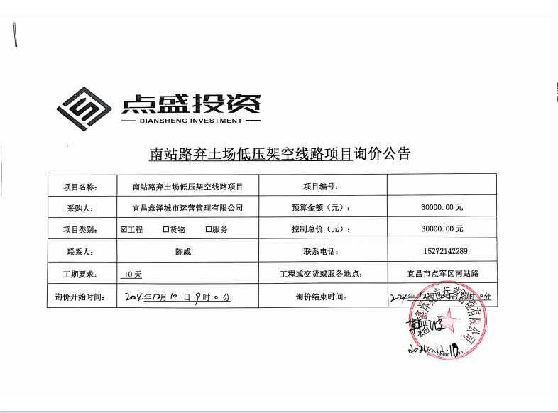 南站路棄土場(chǎng)低壓架空線路項(xiàng)目詢價(jià)公告