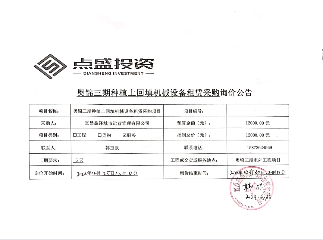 奧錦三期種植土回填機械設(shè)備租賃采購詢價公告